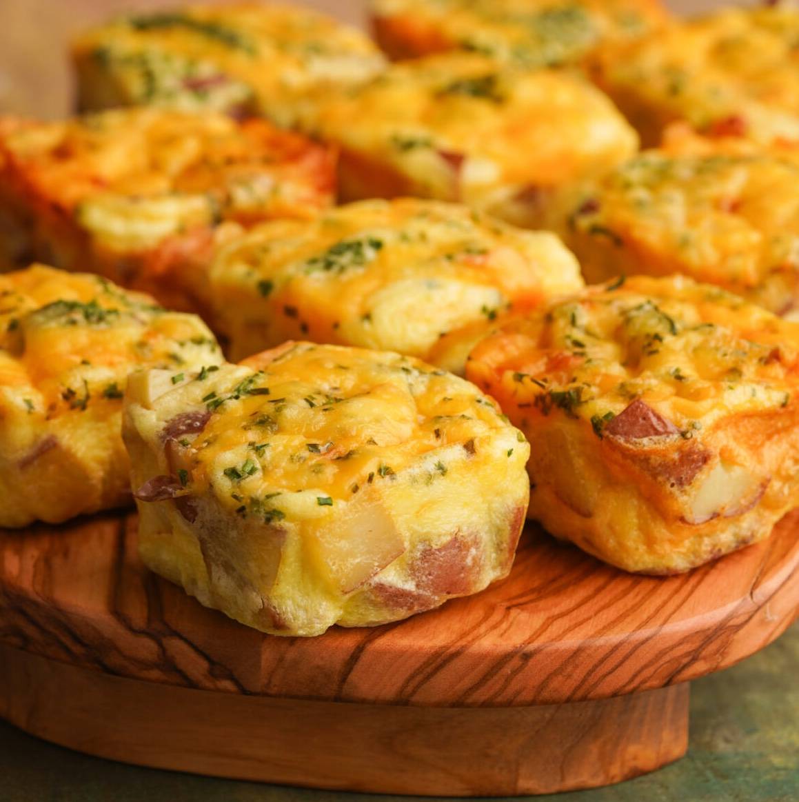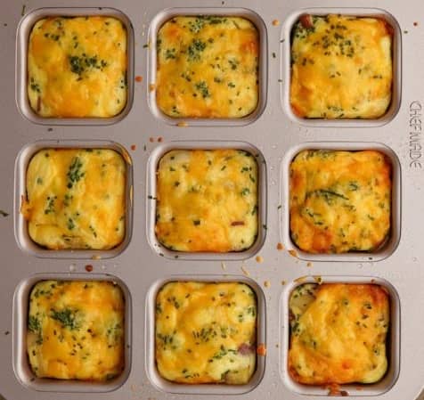 They are a perfectly fluffy egg bite loaded with tender baked potatoes. Each bite gets topped with a layer of melty cheese and fresh chopped chives.